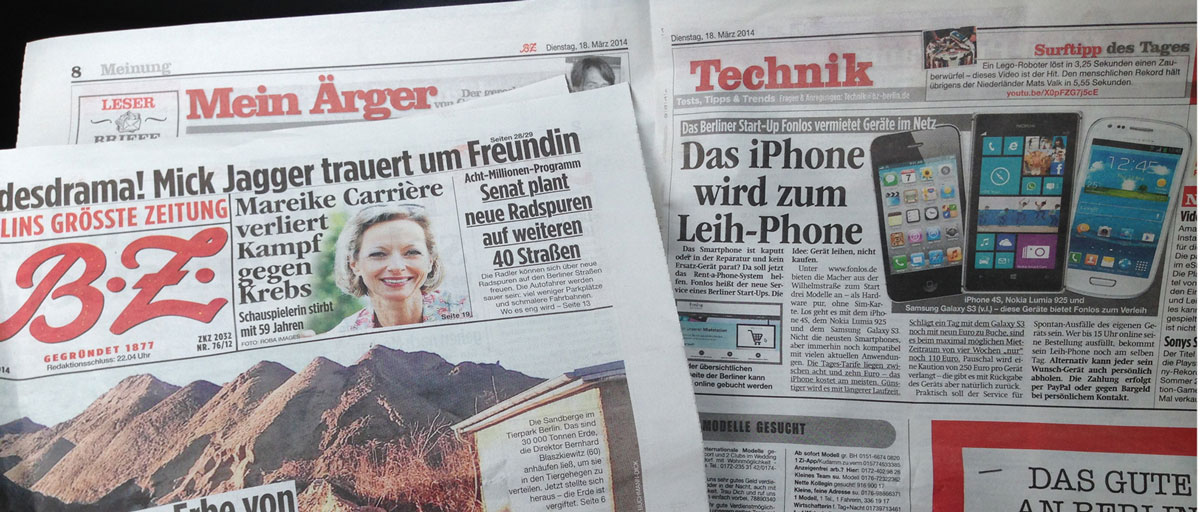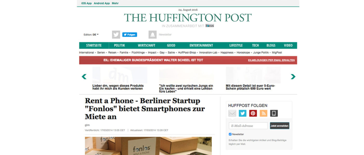 Unter folgendem Link ist der Online-Artikel einsehbar: http://www.huffingtonpost.de/2014/03/17/smartphone-startup-fonlos-miete_n_4977530.html?&ncid=tweetlnkushpmg00000067 | Weiterleitung auf den Artikel des Online-Mediums Quelle Beitragsbild: huffingtonpost.de Über fonlos® fonlos® ist ein Anfang des Jahres 2014 gegründeter Miet-Service für Mobile Devices. Das Berliner Unternehmen vermietet für Zeiträume von mindestens 3 Tagen bis zu 3 Monaten Smartphones, Tablets und weiteres Equipment wie...