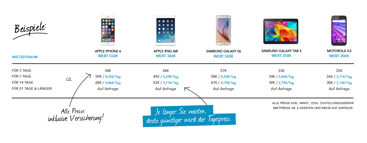 Weiterhin bietet das Unternehmen für gängige und oft nachgefragte Geräte wie das Apple iPhone 5s, iPhone 6, das Apple iPad Air sowie die Samsung Geräte A3, Galaxy S5, S6 sowie das Samsung Galaxy Tab4 niedrigere Preise an. Ohnehin kalkuliert fonlos® seine Preise in Abhängigkeit des Warenwertes. Sinkt dieser auf dem Markt, sinkt der Mietpreis. Kostete beispielsweise ein Apple iPhone 6 Ende des Jahres 2014 (Warenwert: 699 Euro) kurz nach seinem Release rund 90 Euro exkl. MwSt. für eine Woche Mietdauer, belief sich der Mietpreis nach einem halben Jahr auf 78 Euro. Mittlerweile hat sich dieser auf 58 Euro exkl. MwSt. eingependelt. Zukünftig wird fonlos® gleich – teilweise um bis zu 20 % – niedrigere Preise ansetzen, die dann schwächer sinken. Unbeeinflusst davon ist der Versicherungsschutz, der nach wie vor umfassend und in alle Preise inkludiert ist.